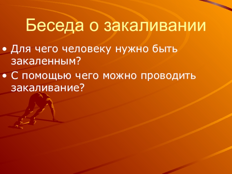 Беседа о закаливанииДля чего человеку нужно быть закаленным?С помощью чего можно проводить закаливание?