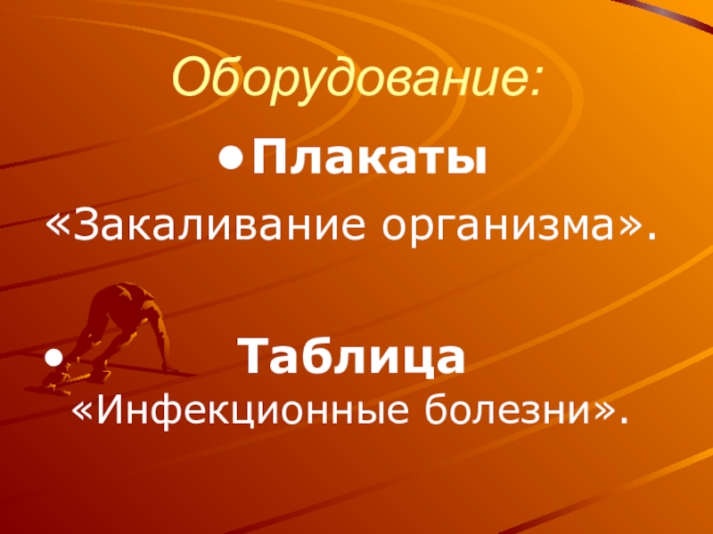 Оборудование:Плакаты«Закаливание организма».     Таблица «Инфекционные болезни».