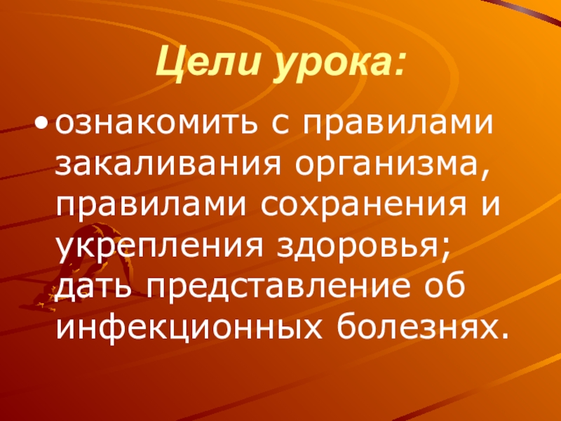 Цели урока:ознакомить с правилами закаливания организма, правилами сохранения и укрепления здоровья; дать представление об инфекционных болезнях.