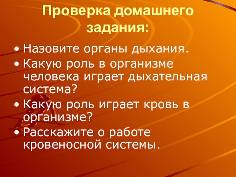Проверка домашнего задания:Назовите органы дыхания.Какую роль в организме человека играет дыхательная система?Какую роль играет кровь в организме?Расскажите