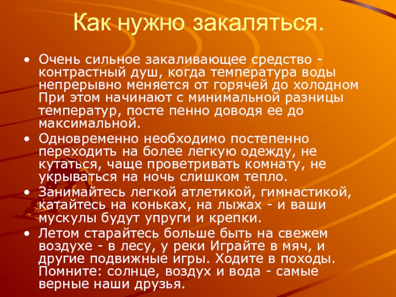 ознакомить с правилами закаливания организма, правилами сохранения и укрепления здоровья;