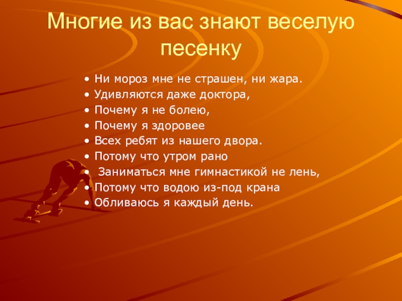 Многие из вас знают веселую песенкуНи мороз мне не страшен, ни жара.Удивляются даже доктора,Почему я не болею,Почему