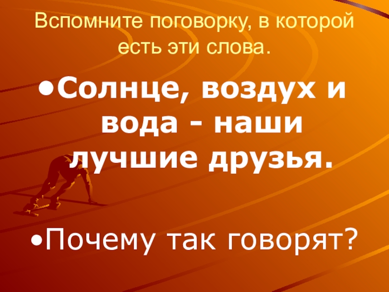 Вспомните поговорку, в которой есть эти слова.Солнце, воздух и вода - наши лучшие друзья. Почему так говорят?