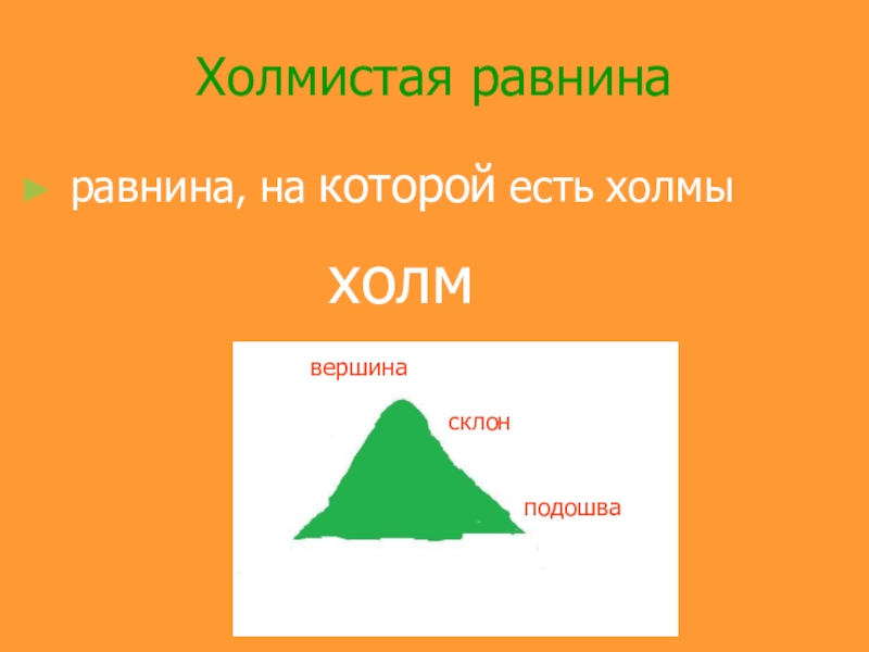 Холмистая равнинаравнина, на которой есть холмыхолмвершинасклонподошва