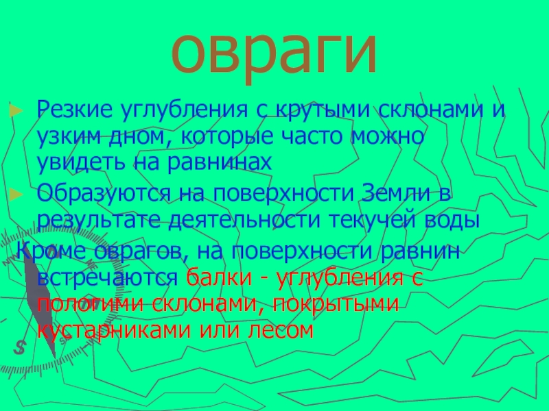 оврагиРезкие углубления с крутыми склонами и узким дном, которые часто можно увидеть на равнинахОбразуются на поверхности Земли