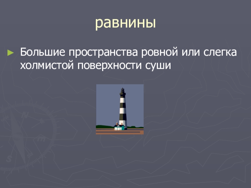 равниныБольшие пространства ровной или слегка холмистой поверхности суши