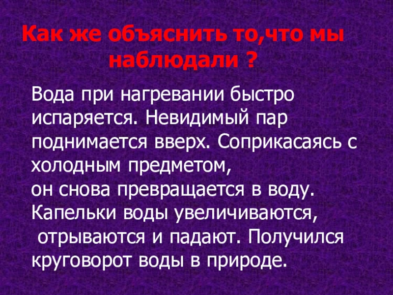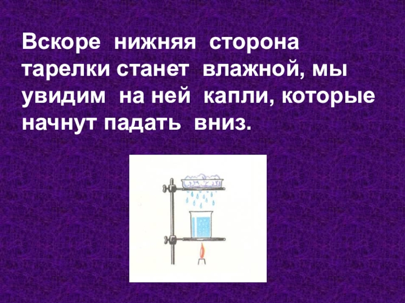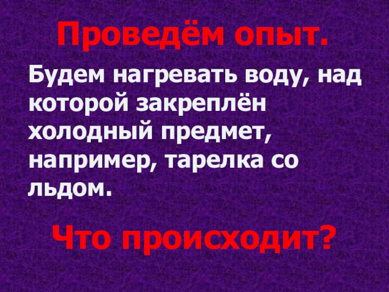 Будем нагревать воду, над которой закреплён холодный предмет, например, тарелка со льдом.