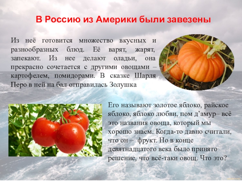 Его называют золотое яблоко, райское яблоко, яблоко любви, пом д’амур– всё это названия овоща, который мы хорошо знаем. Когда-то давно считали, что он – фрукт. Но в конце девятнадцатого века было принято решение, что всё-таки овощ. Что это?