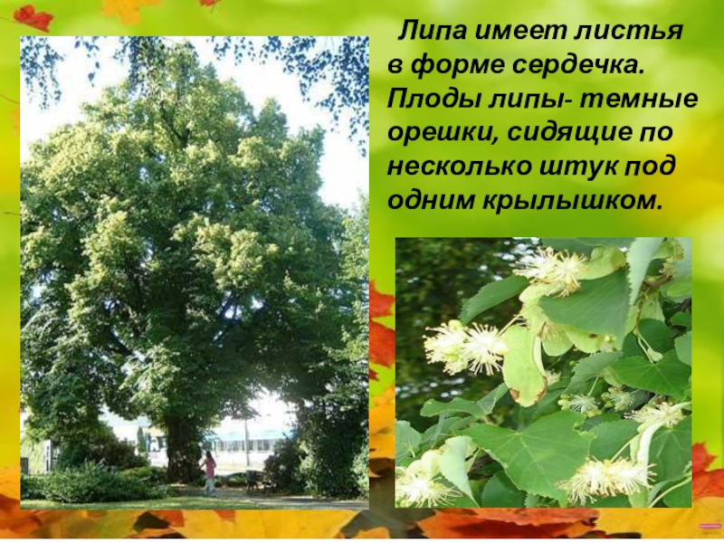 Слайд 18 Липа имеет листья в форме сердечка. Плоды липы- темные