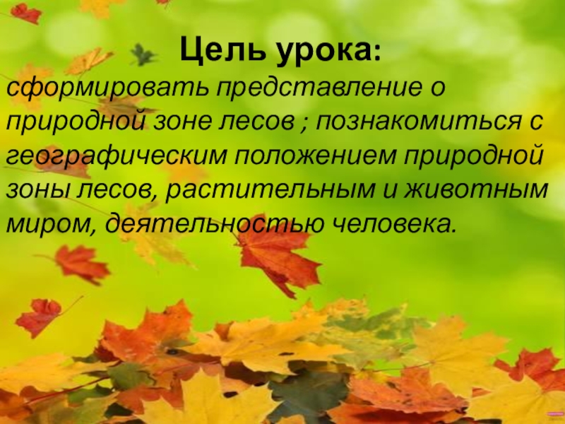 Цель урока: сформировать представление о природной зоне лесов ; познакомиться с географическим положением природной зоны лесов, растительным