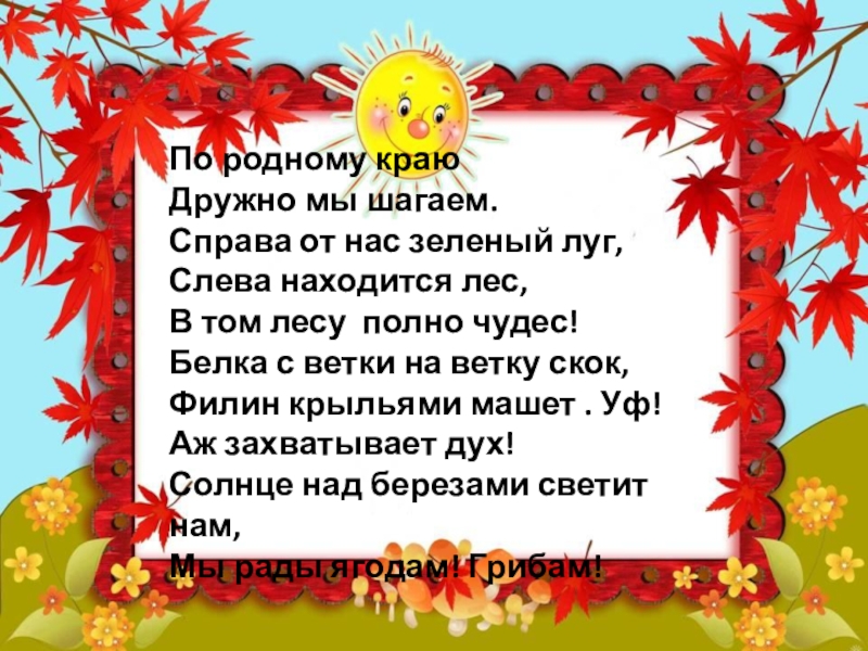 По родному краюДружно мы шагаем.Справа от нас зеленый луг,Слева находится лес,В том лесу полно чудес!Белка с ветки