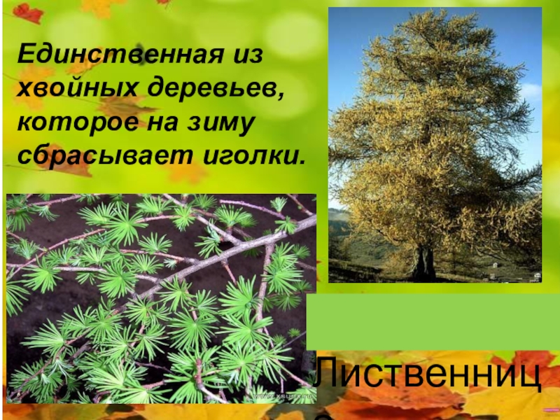 Слайд 11Единственная из хвойных деревьев, которое на зиму сбрасывает иголки.