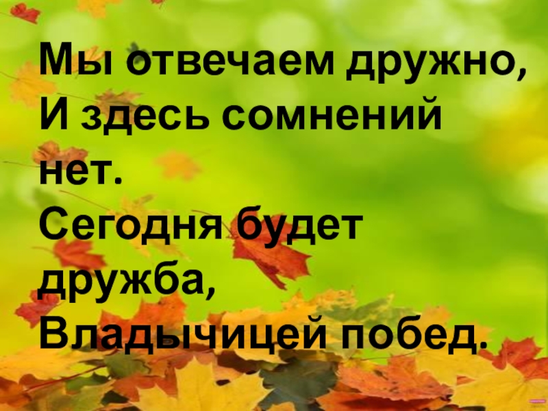 Мы отвечаем дружно,И здесь сомнений нет.Сегодня будет дружба,Владычицей побед.