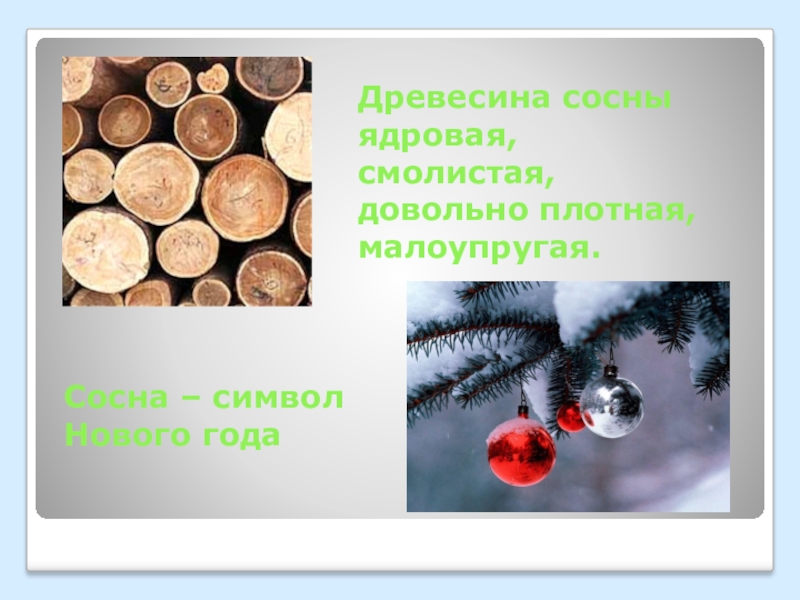 Древесина сосны ядровая, смолистая, довольно плотная, малоупругая.Сосна – символ Нового года