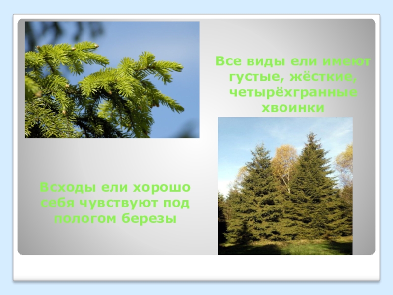 Все виды ели имеют густые, жёсткие, четырёхгранные хвоинкиВсходы ели хорошо себя чувствуют под пологом березы