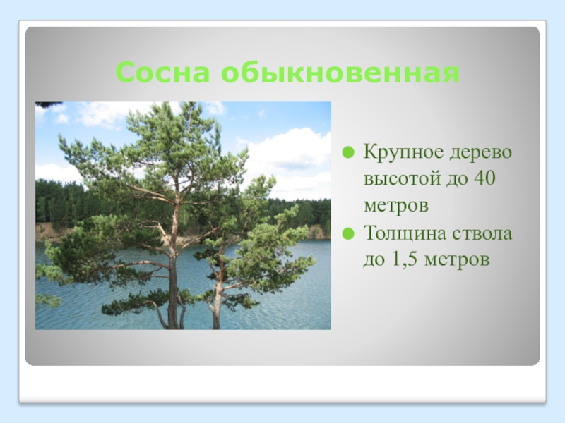 Сосна обыкновеннаяКрупное дерево высотой до 40 метровТолщина ствола до 1,5 метров