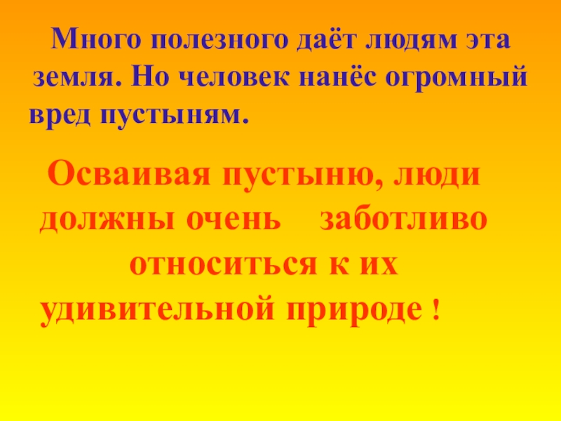 Осваивая пустыню, люди должны очень заботливо относиться к их удивительной природе !
