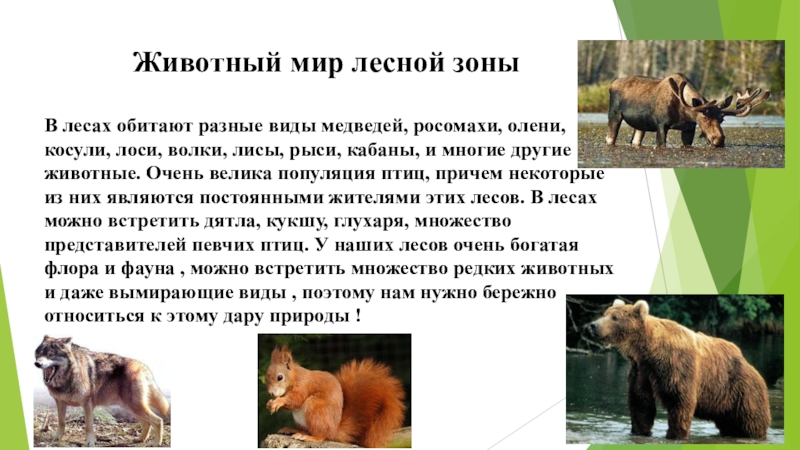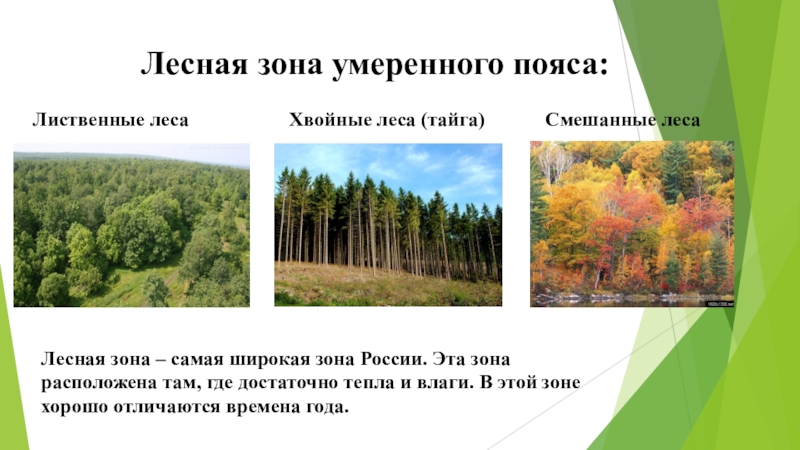Лесная зона – самая широкая зона России. Эта зона расположена там, где достаточно тепла и влаги. В этой зоне хорошо отличаются времена года.