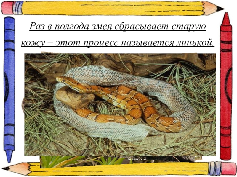 Слайд 6Раз в полгода змея сбрасывает старую кожу – этот процесс называется