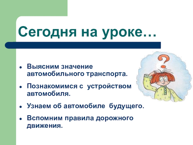 Сегодня на уроке…Выясним значение автомобильного транспорта.Познакомимся с устройством автомобиля.Узнаем об автомобиле будущего.Вспомним правила дорожного движения.
