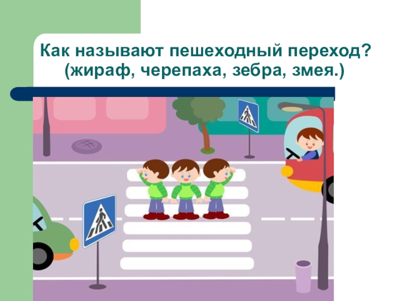 Слайд 23Как называют пешеходный переход? (жираф, черепаха, зебра, змея.)