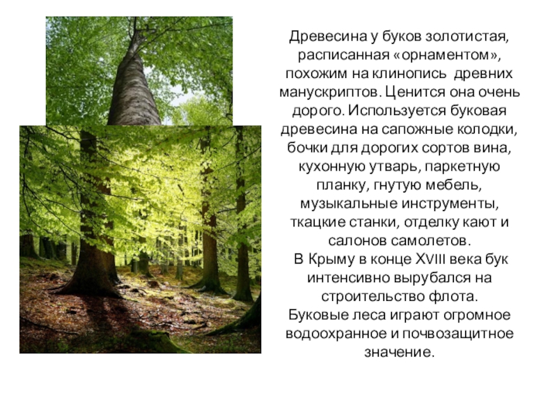 Слайд 13Древесина у буков золотистая, расписанная «орнаментом», похожим на клинопись древних манускриптов.