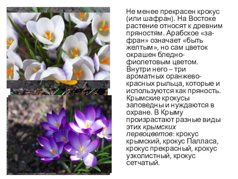 Слайд 15 Не менее прекрасен крокус (или шафран). На Востоке