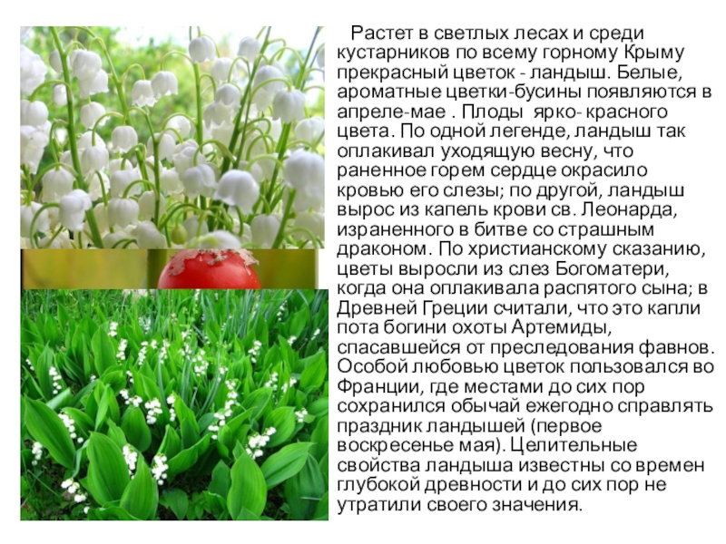 кустарников по всему горному Крыму прекрасный цветок - ландыш. Белые, ароматные цветки-бусины появляются в апреле-мае . Плоды ярко- красного цвета. По одной легенде, ландыш так оплакивал уходящую весну, что раненное горем сердце окрасило кровью его слезы; по другой, ландыш вырос из капель крови св. Леонарда, израненного в битве со страшным драконом. По христианскому сказанию, цветы выросли из слез Богоматери, когда она оплакивала распятого сына; в Древней Греции считали, что это капли пота богини охоты Артемиды, спасавшейся от преследования фавнов. Особой любовью цветок пользовался во Франции, где местами до сих пор сохранился обычай ежегодно справлять праздник ландышей (первое воскресенье мая). Целительные свойства ландыша известны со времен глубокой древности и до сих пор не утратили своего значения.