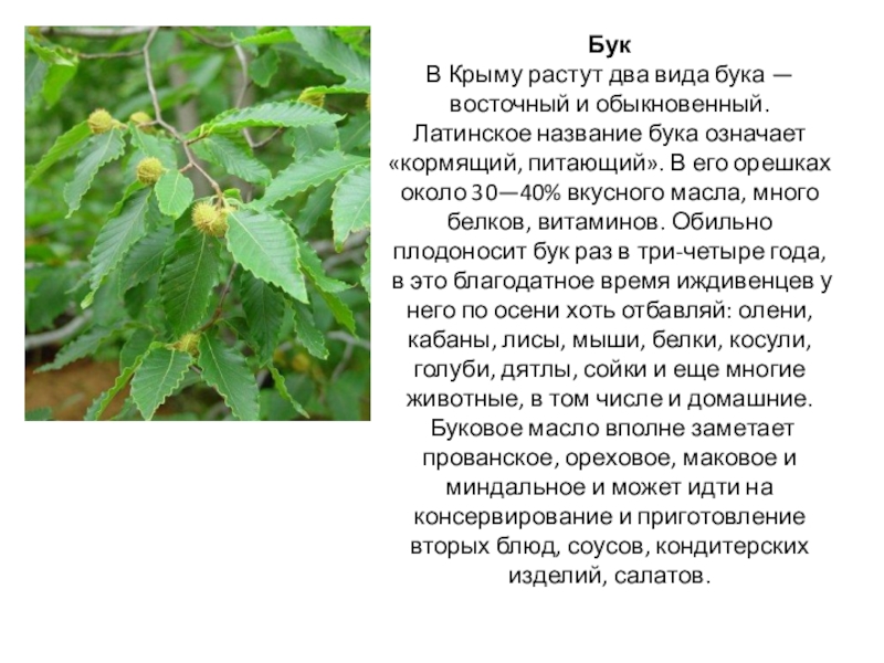 название бука означает «кормящий, питающий». В его орешках около 30—40% вкусного масла, много белков, витаминов. Обильно плодоносит бук раз в три-четыре года, в это благодатное время иждивенцев у него по осени хоть отбавляй: олени, кабаны, лисы, мыши, белки, косули, голуби, дятлы, сойки и еще многие животные, в том числе и домашние.