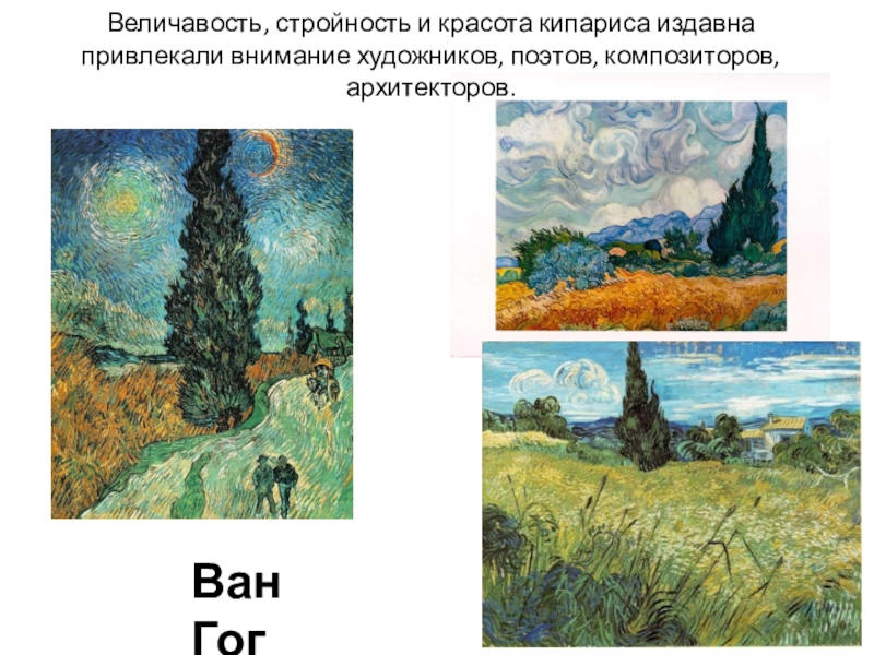 Слайд 8Величавость, стройность и красота кипариса издавна привлекали внимание художников, поэтов, композиторов,