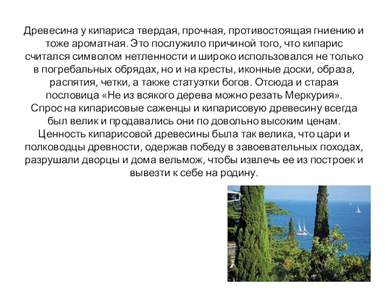 послужило причиной того, что кипарис считался символом нетленности и широко использовался не только в погребальных обрядах, но и на кресты, иконные доски, образа, распятия, четки, а также статуэтки богов. Отсюда и старая пословица «Не из всякого дерева можно резать Меркурия».