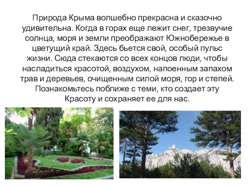 Слайд 2Природа Крыма волшебно прекрасна и сказочно удивительна. Когда в горах еще