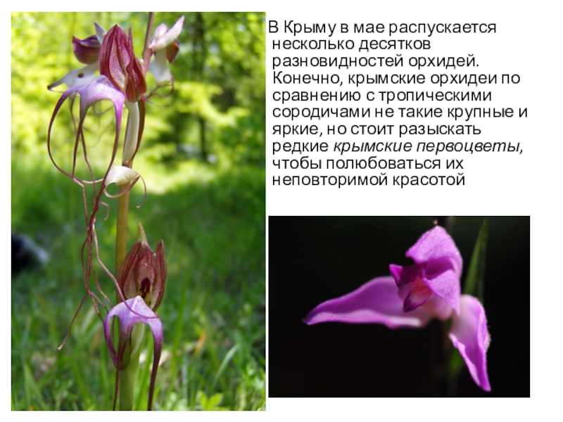 Слайд 19 В Крыму в мае распускается несколько десятков разновидностей орхидей.