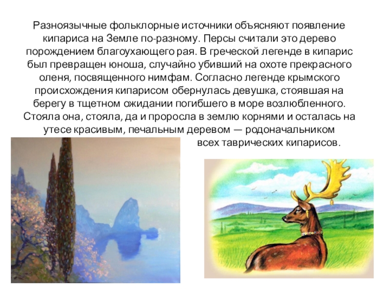 Слайд 7Разноязычные фольклорные источники объясняют появление кипариса на Земле по-разному. Персы считали