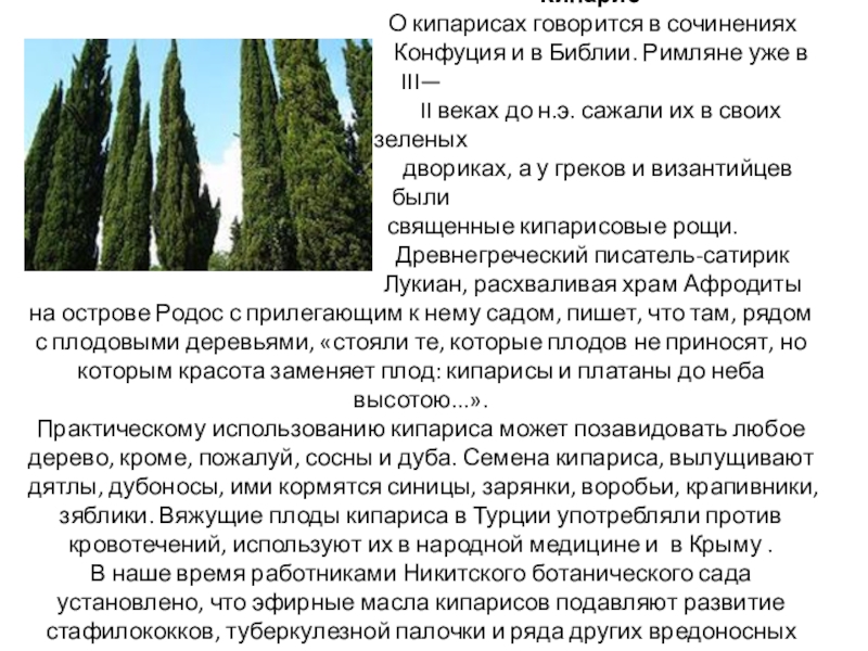В наше время работниками Никитского ботанического сада установлено, что эфирные масла кипарисов подавляют развитие стафилококков, туберкулезной палочки и ряда других вредоносных для человека микроорганизмов.