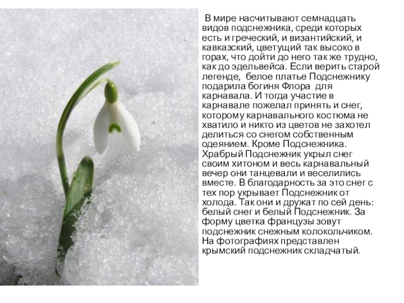 которых есть и греческий, и византийский, и кавказский, цветущий так высоко в горах, что дойти до него так же трудно, как до эдельвейса. Если верить старой легенде, белое платье Подснежнику подарила богиня Флора для карнавала. И тогда участие в карнавале пожелал принять и снег, которому карнавального костюма не хватило и никто из цветов не захотел делиться со снегом собственным одеянием. Кроме Подснежника. Храбрый Подснежник укрыл снег своим хитоном и весь карнавальный вечер они танцевали и веселились вместе. В благодарность за это снег с тех пор укрывает Подснежник от холода. Так они и дружат по сей день: белый снег и белый Подснежник. За форму цветка французы зовут подснежник снежным колокольчиком. На фотографиях представлен крымский подснежник складчатый.
