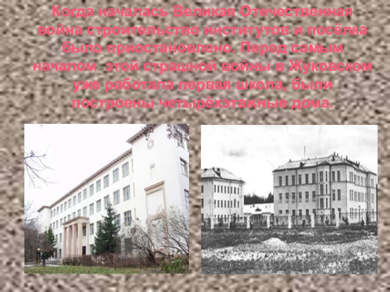 Перед самым началом этой страшной войны в Жуковском уже работала первая школа, были построены четырёхэтажные дома.
