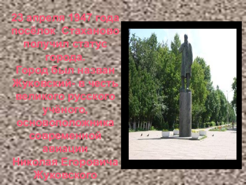 23 апреля 1947 года посёлок Стаханово получил статус города.Город был назван Жуковский- в честь великого русского учёного,