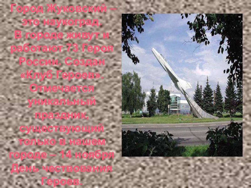 Город Жуковский – это наукоград. В городе живут и работают 73 Героя России. Создан «Клуб Героев». Отмечается