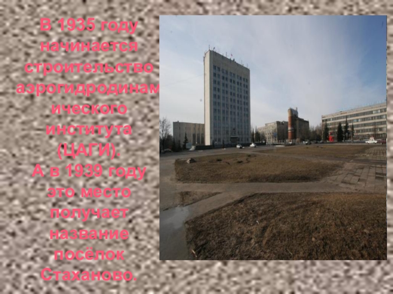 В 1935 году начинается строительство аэрогидродинамического института (ЦАГИ).А в 1939 году это место получает название посёлок Стаханово.