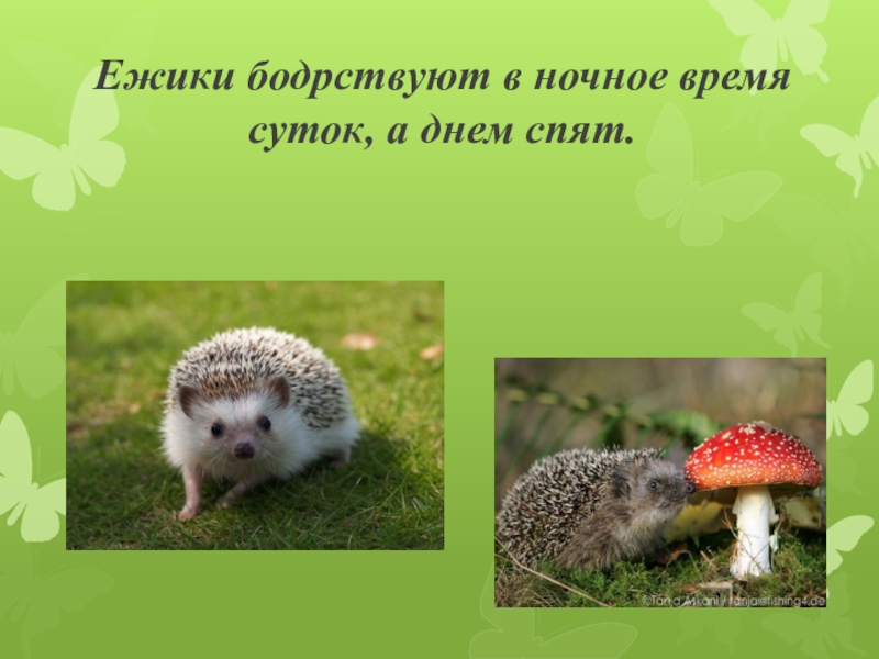 Слайд 4Ежики бодрствуют в ночное время суток, а днем спят.