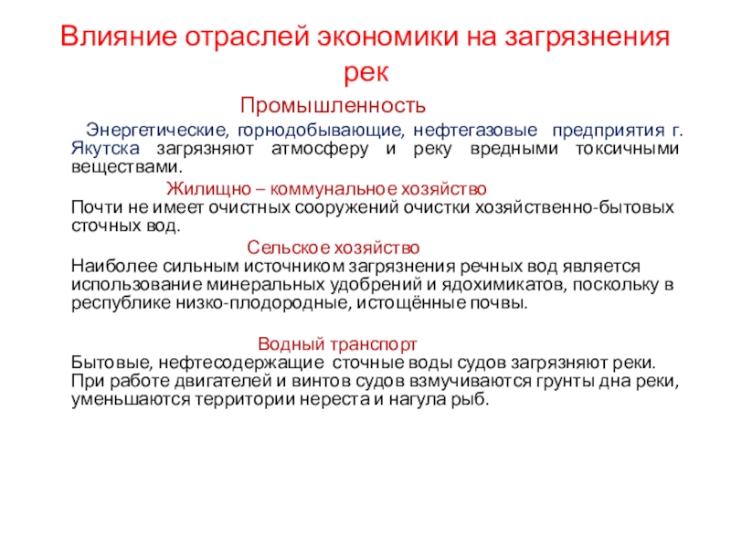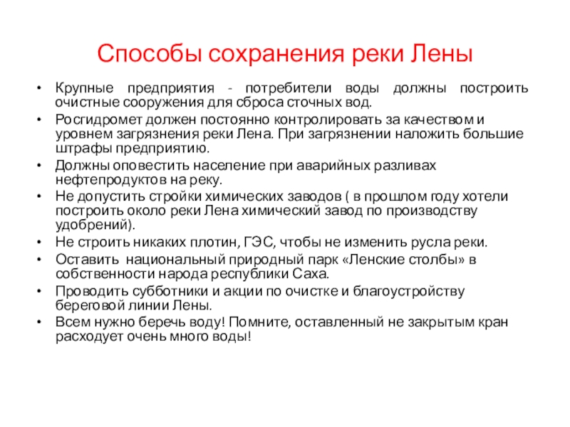 Лена — это одна из самых чистых рек мира. Русло реки не изменено человеком. На данный момент на реке не построено никаких плотин, ГЭС, или иных сооружений.