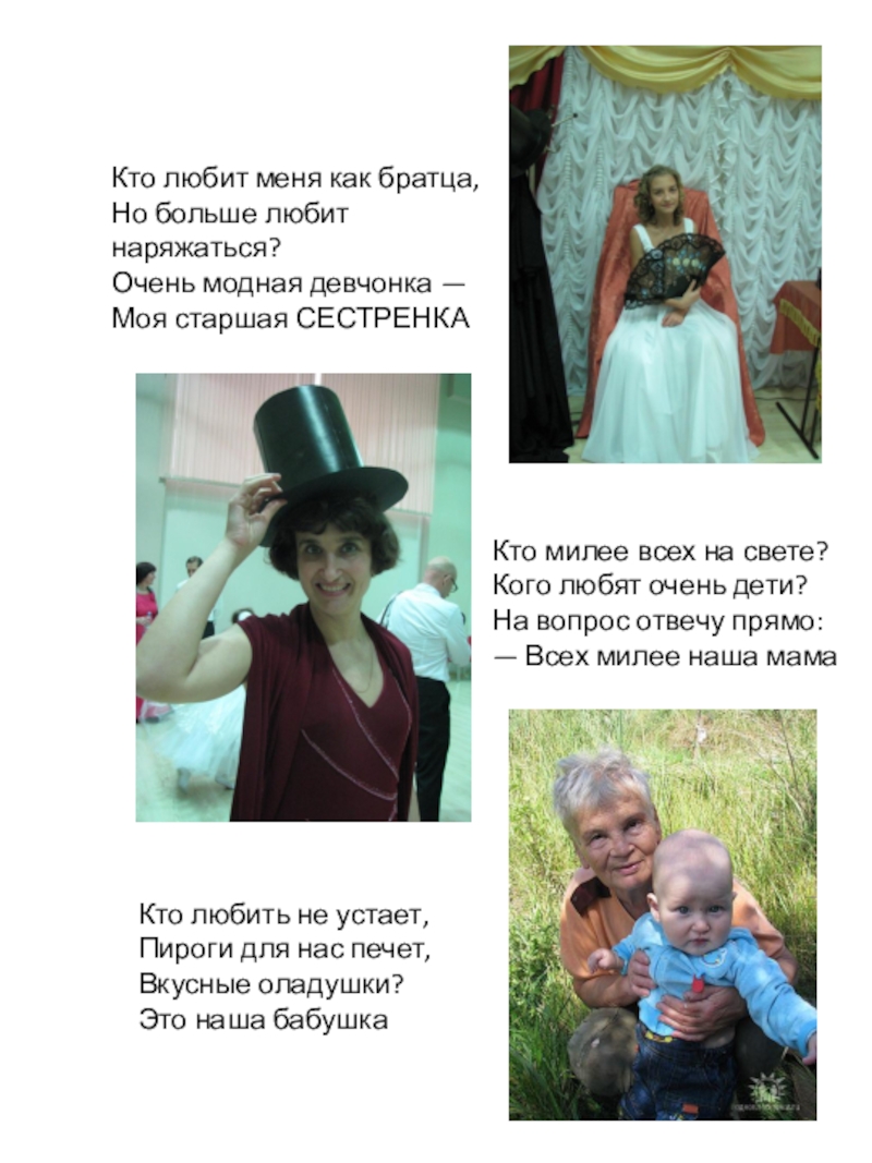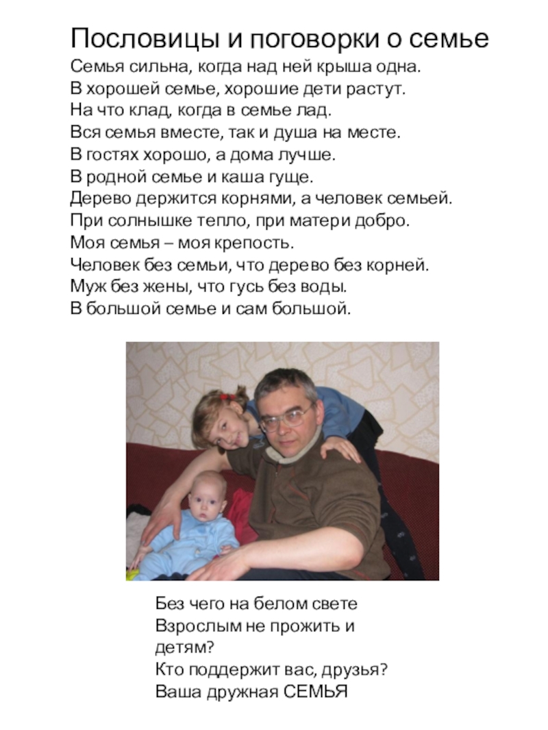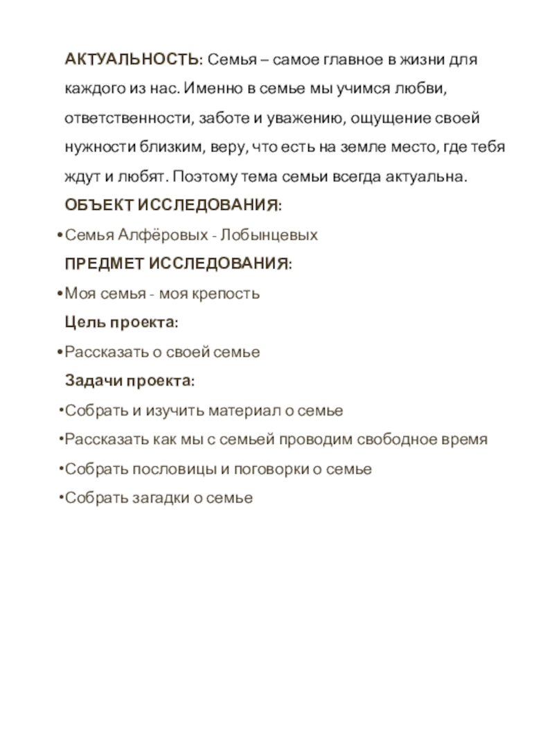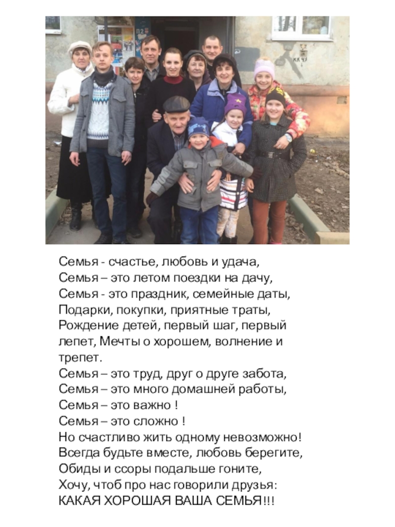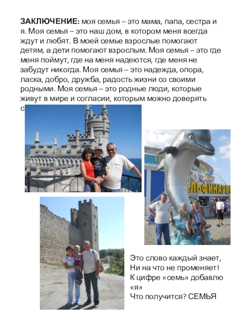 ЗАКЛЮЧЕНИЕ: моя семья – это мама, папа, сестра и я. Моя семья – это наш дом, в котором меня всегда ждут и любят. В моей семье взрослые помогают детям, а дети помогают взрослым. Моя семья – это где меня поймут, где на меня надеются, где меня не забудут никогда. Моя семья – это надежда, опора, ласка, добро, дружба, радость жизни со своими родными. Моя семья – это родные люди, которые живут в мире и согласии, которым можно доверять свои секреты.
