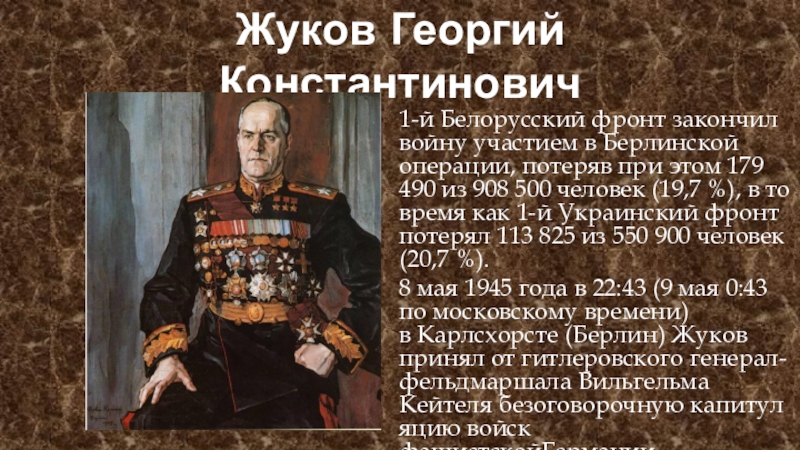 8 мая 1945 года в 22:43 (9 мая 0:43 по московскому времени) в Карлсхорсте (Берлин) Жуков принял от гитлеровского генерал-фельдмаршала Вильгельма Кейтеля безоговорочную капитуляцию войск фашистскойГермании.