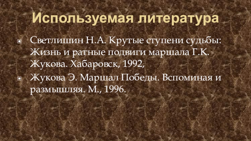 Жукова Э. Маршал Победы. Вспоминая и размышляя. М., 1996.