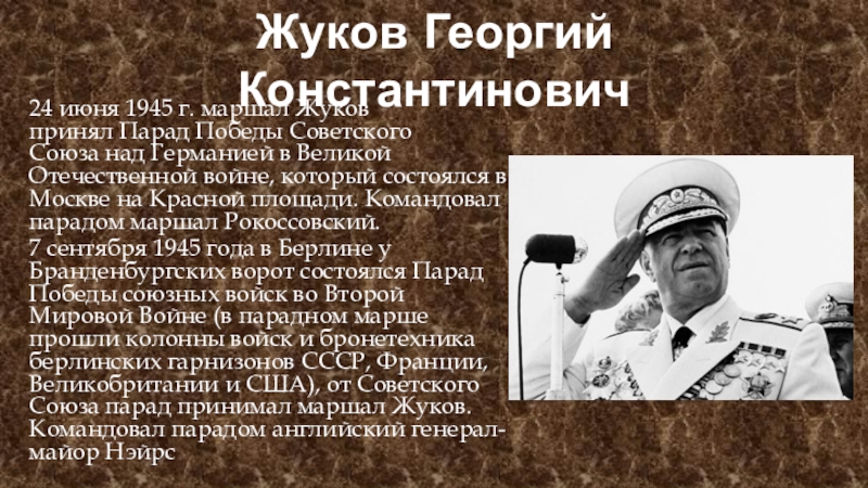 24 июня 1945 г. маршал Жуков принял Парад Победы Советского Союза над Германией в Великой Отечественной войне,
