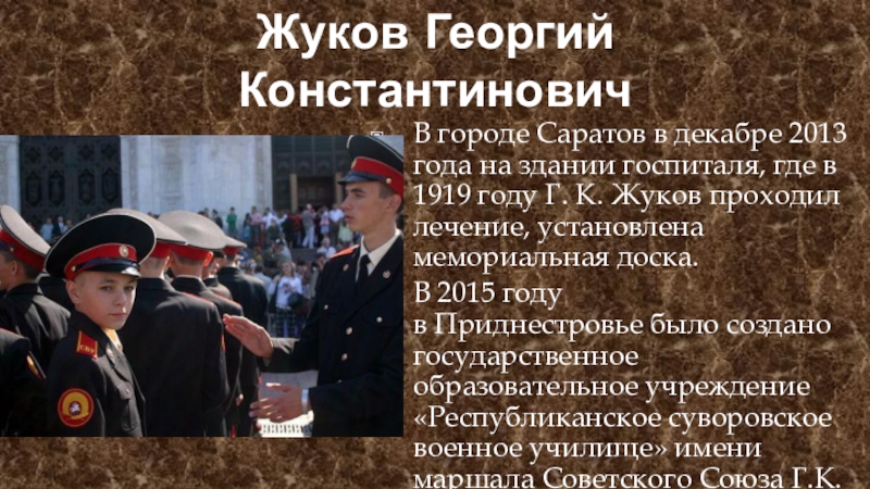 В 2015 году в Приднестровье было создано государственное образовательное учреждение «Республиканское суворовское военное училище» имени маршала Советского Союза Г.К. Жукова.