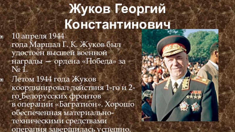 10 апреля 1944 года Маршал Г. К. Жуков был удостоен высшей военной награды — ордена «Победа» за