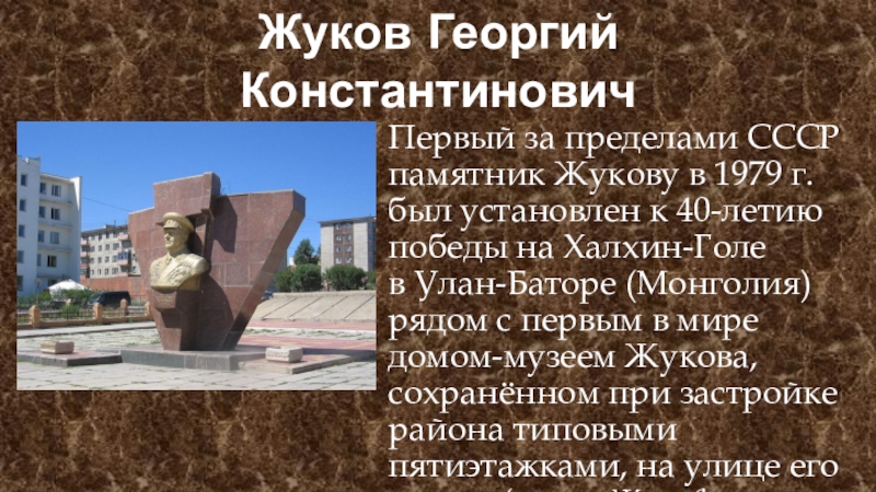 установлен к 40-летию победы на Халхин-Голе в Улан-Баторе (Монголия) рядом с первым в мире домом-музеем Жукова, сохранённом при застройке района типовыми пятиэтажками, на улице его имени (монг. Жуковын гудамж)