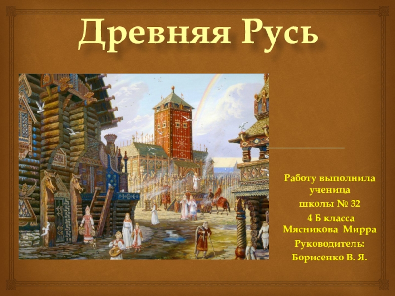 Древняя РусьРаботу выполнила ученицашколы № 32 4 Б класса Мясникова Мирра Руководитель: Борисенко В. Я.